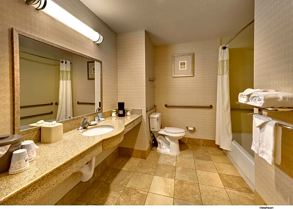 This disability access room includes an HDTV, a microwave and a refrigerator.